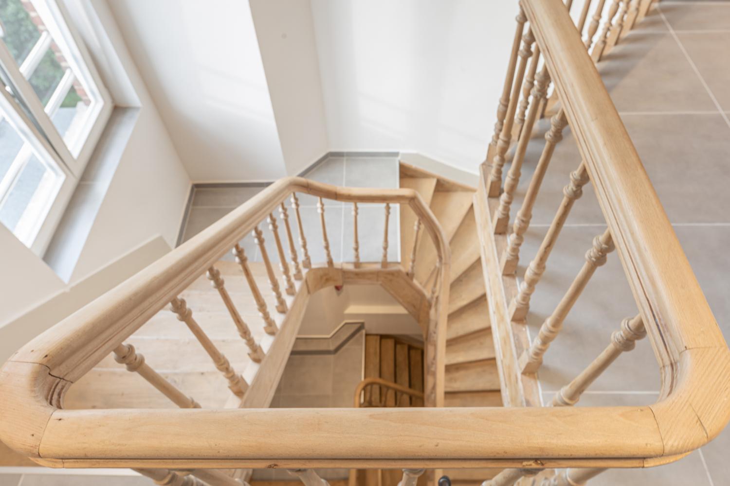 Dit fraaie pand ademt stijl dankzij de imposante inkomhal met een massief eikenhouten trap. Ook in de kamers ligt parket in eik. Een echte buitenkans.