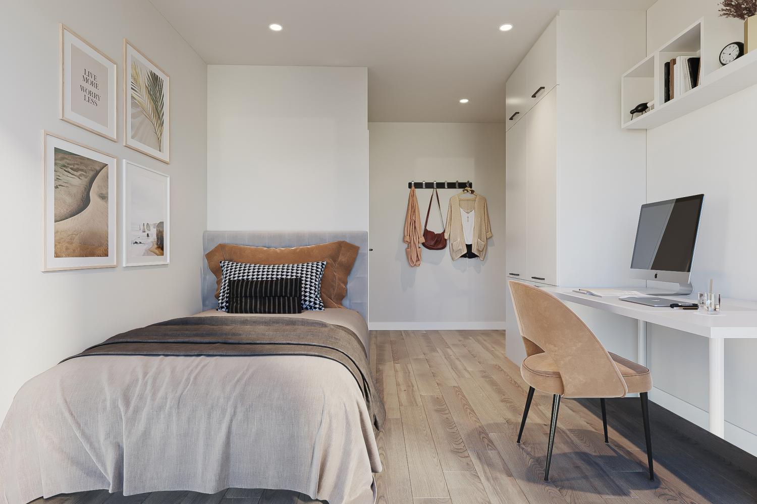 Deze studentenresidentie zal 13 kamers met privé badkamer huisvesten. Dit met een mooie gemeenschappelijke buitenruimte, aangrenzende keuken en overdekte fietsenstalling. Elke kamer zal in onze gekende luxueuze stijl afgewerkt en ingericht worden met vaste en losse meubels. Bovendien voldoet elke kamer aan de meest recente en strenge normen inzake brandveiligheid, oppervlakte en wooncomfort.