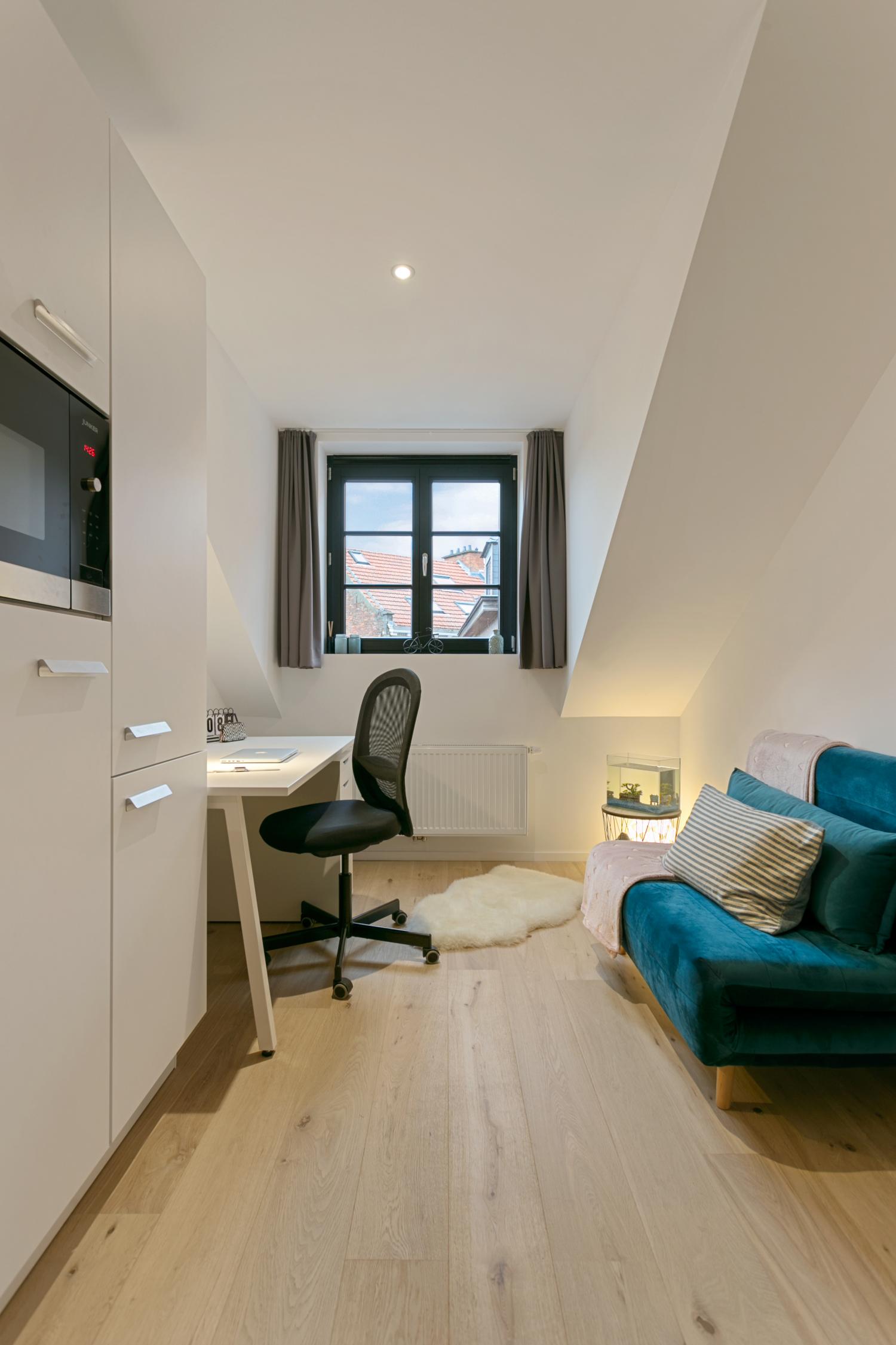 De studio’s worden stijlvol afgewerkt en voorzien van privébadkamer, moderne kitchenette en ingebouwde microgolfoven. De kamers beschikken allemaal over eigen sanitair. De ruime en gezellige keuken is gemeenschappelijk.